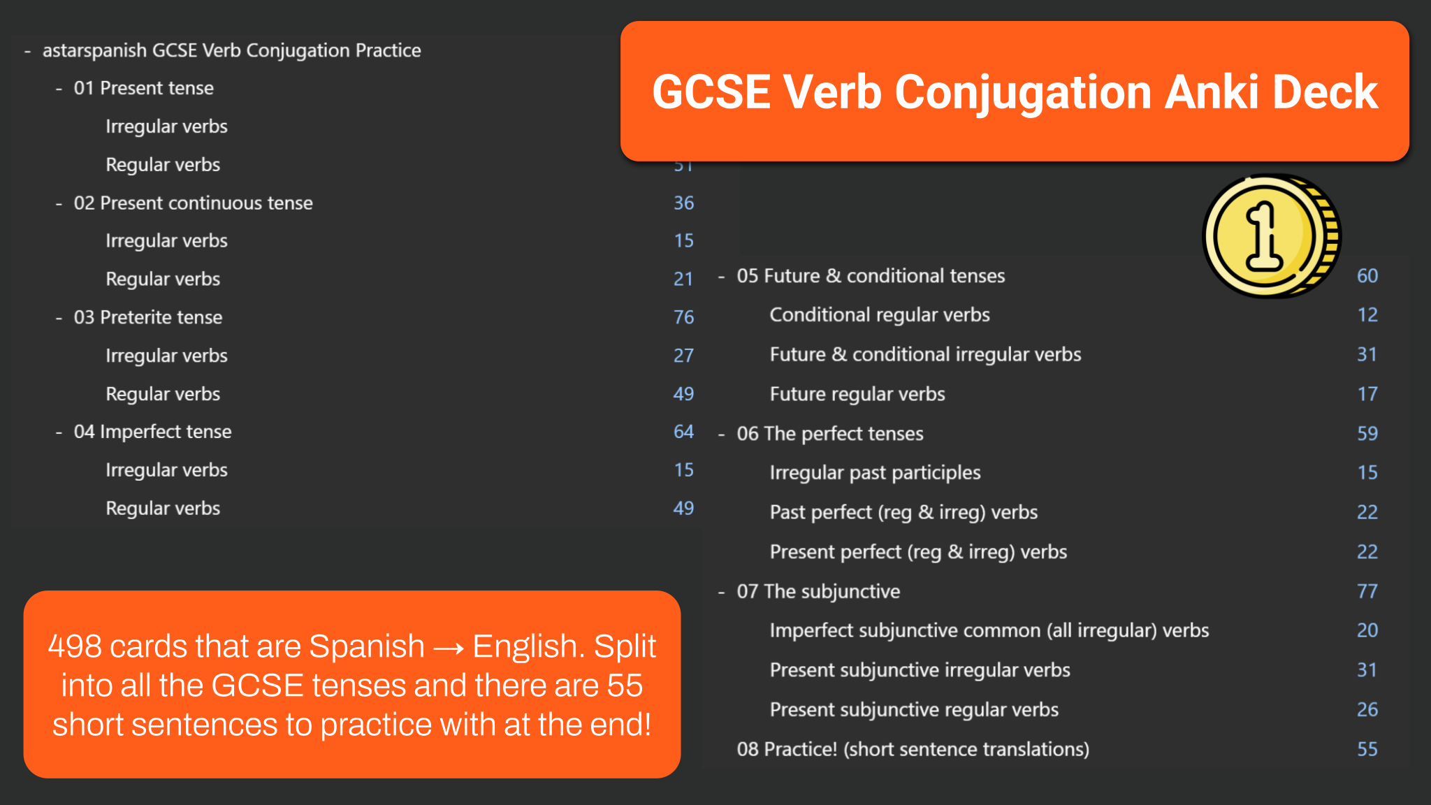 498 cards that are Spanish → English. Split into all the GCSE tenses and there are 55 short sentences to practice with at the end!