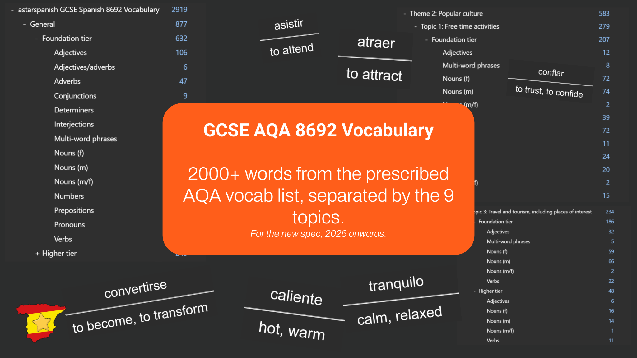 All the 2919 words from the prescribed AQA vocab list, separated by the 9 topics and the ‘general’ vocabulary.